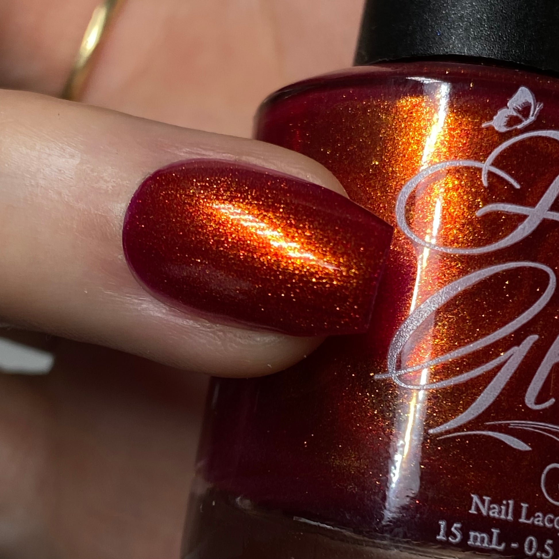 Pinkish red base with strong gold/copper shimmer.