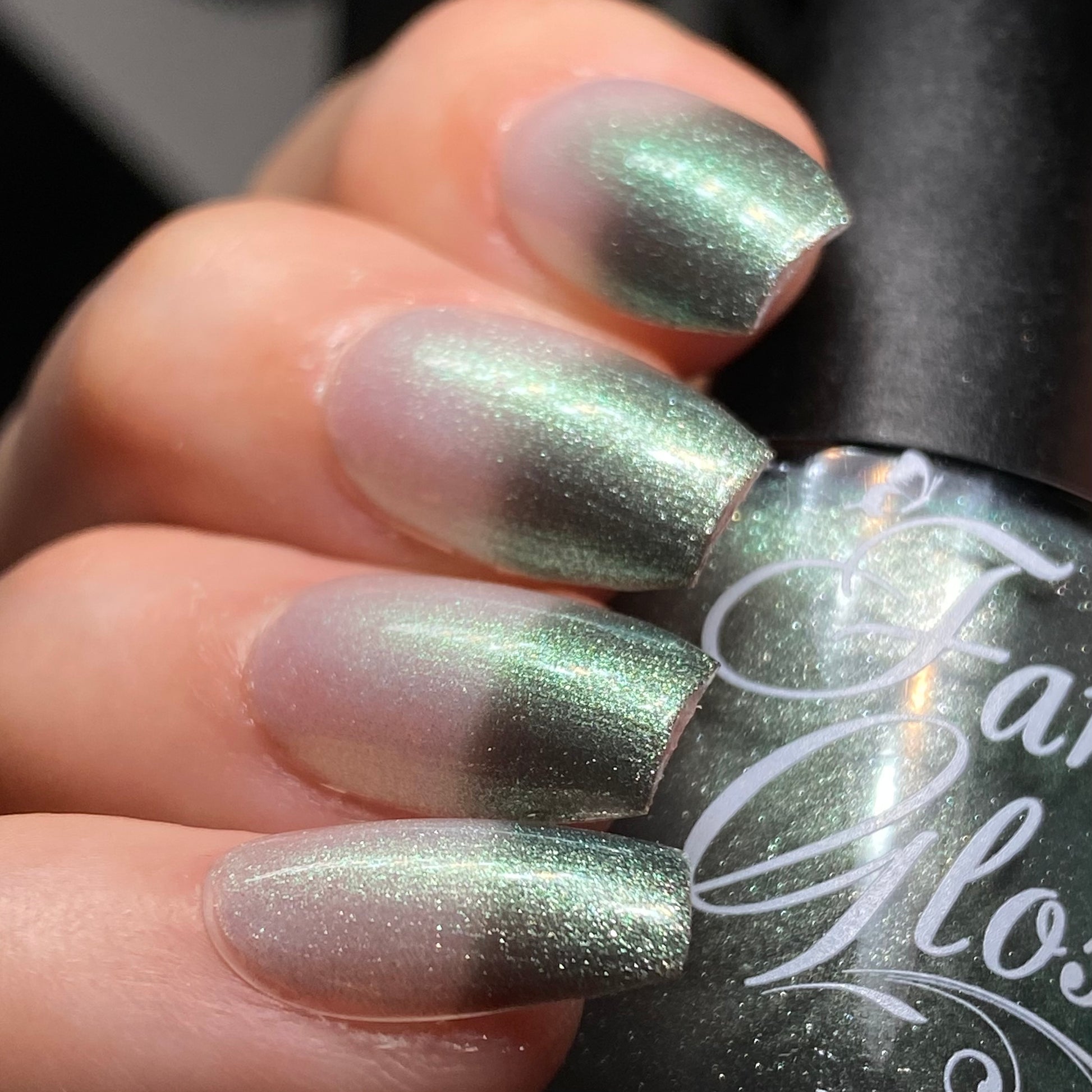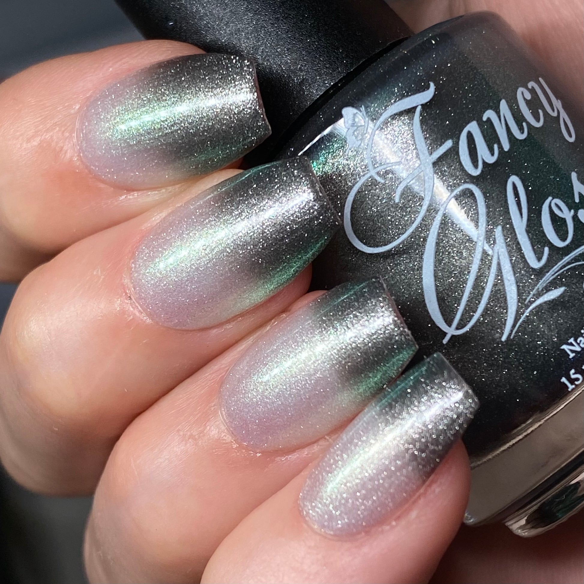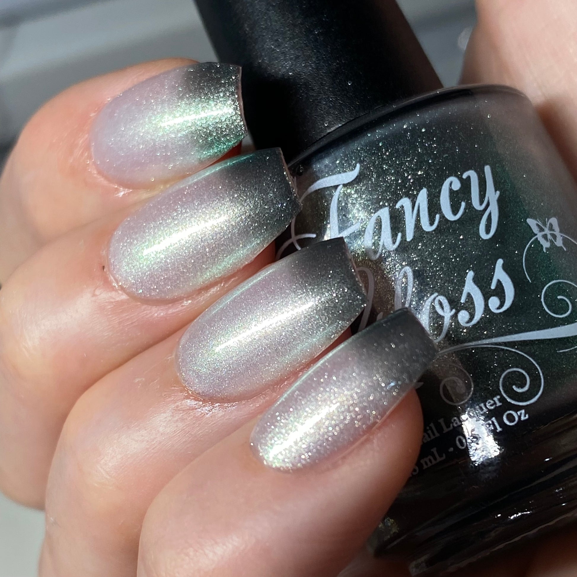 Greenish/grey (cold) to pearlescent white shimmer with subtle pink/aqua/green shifts.