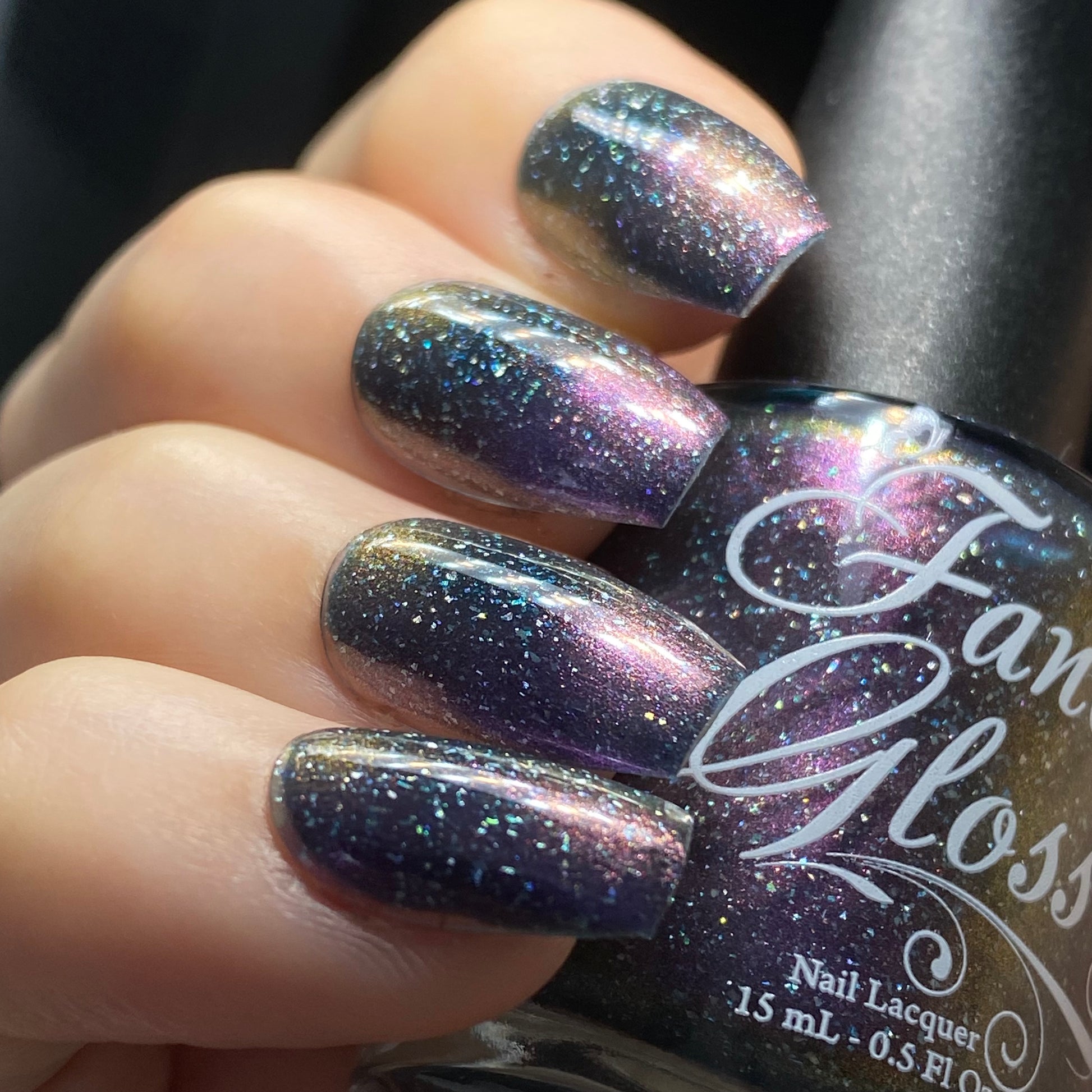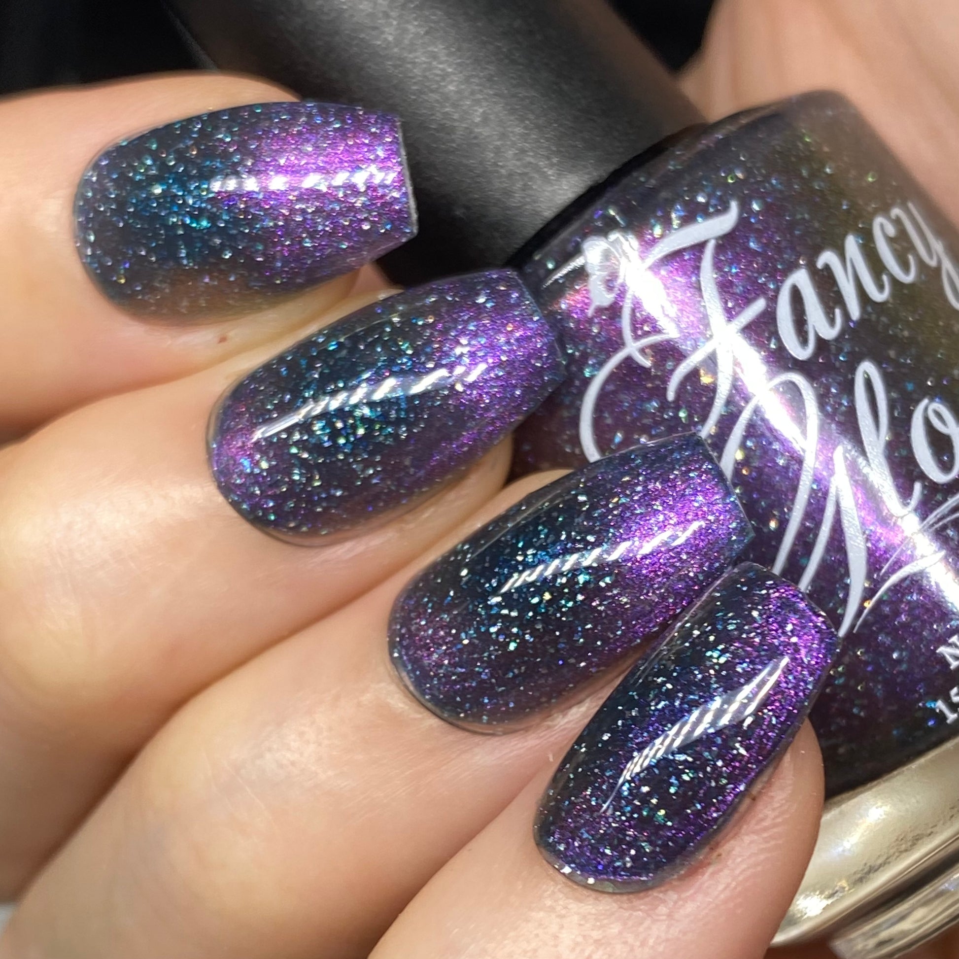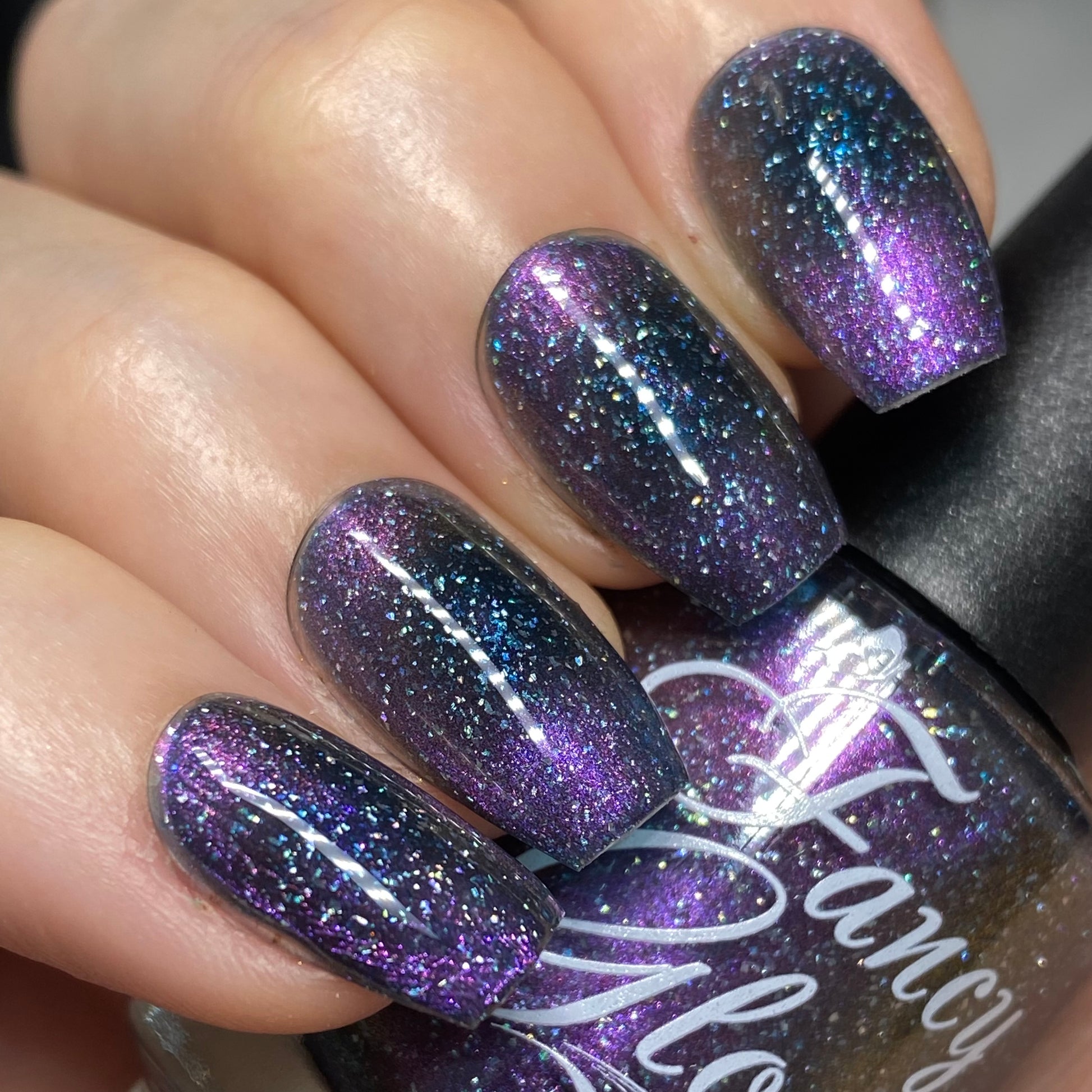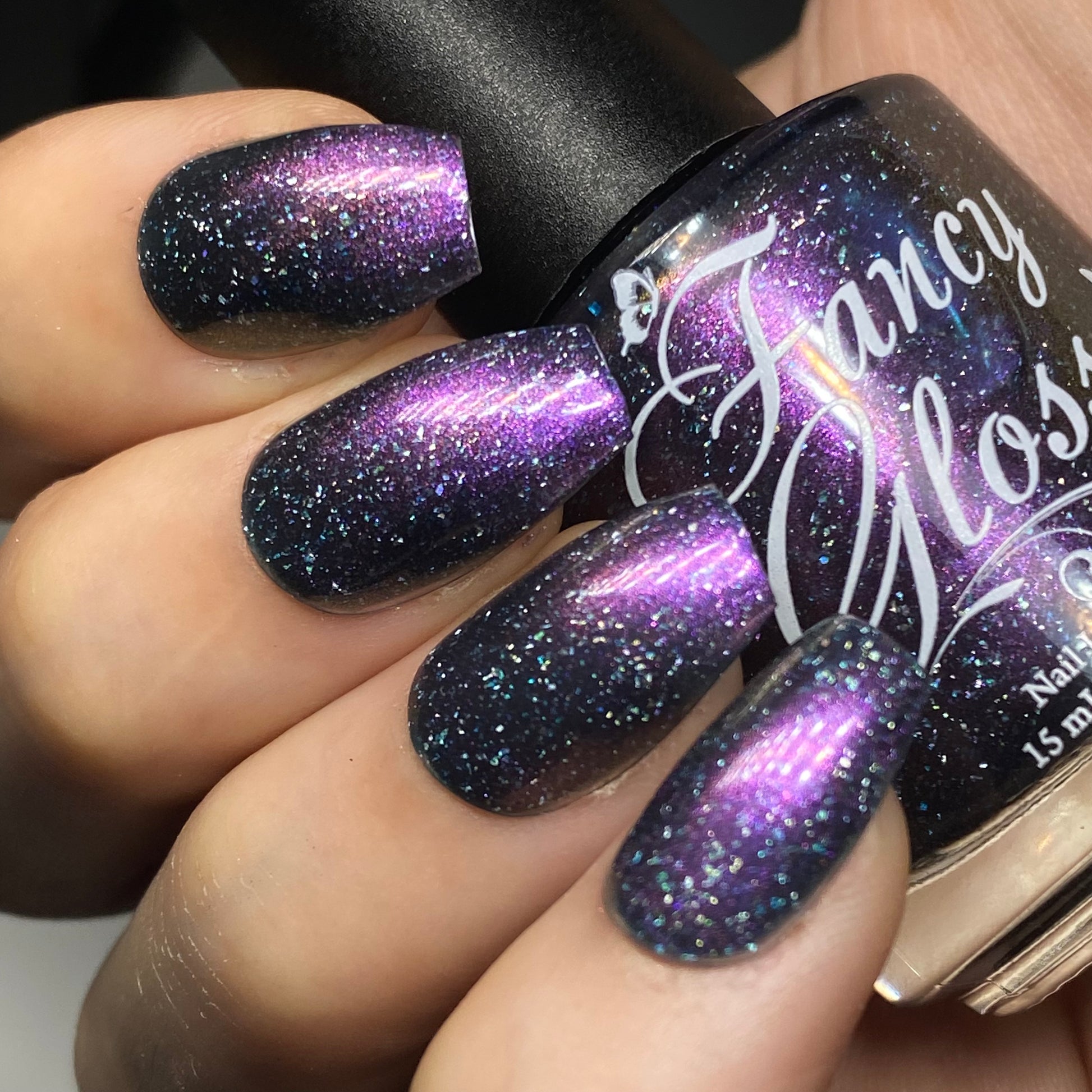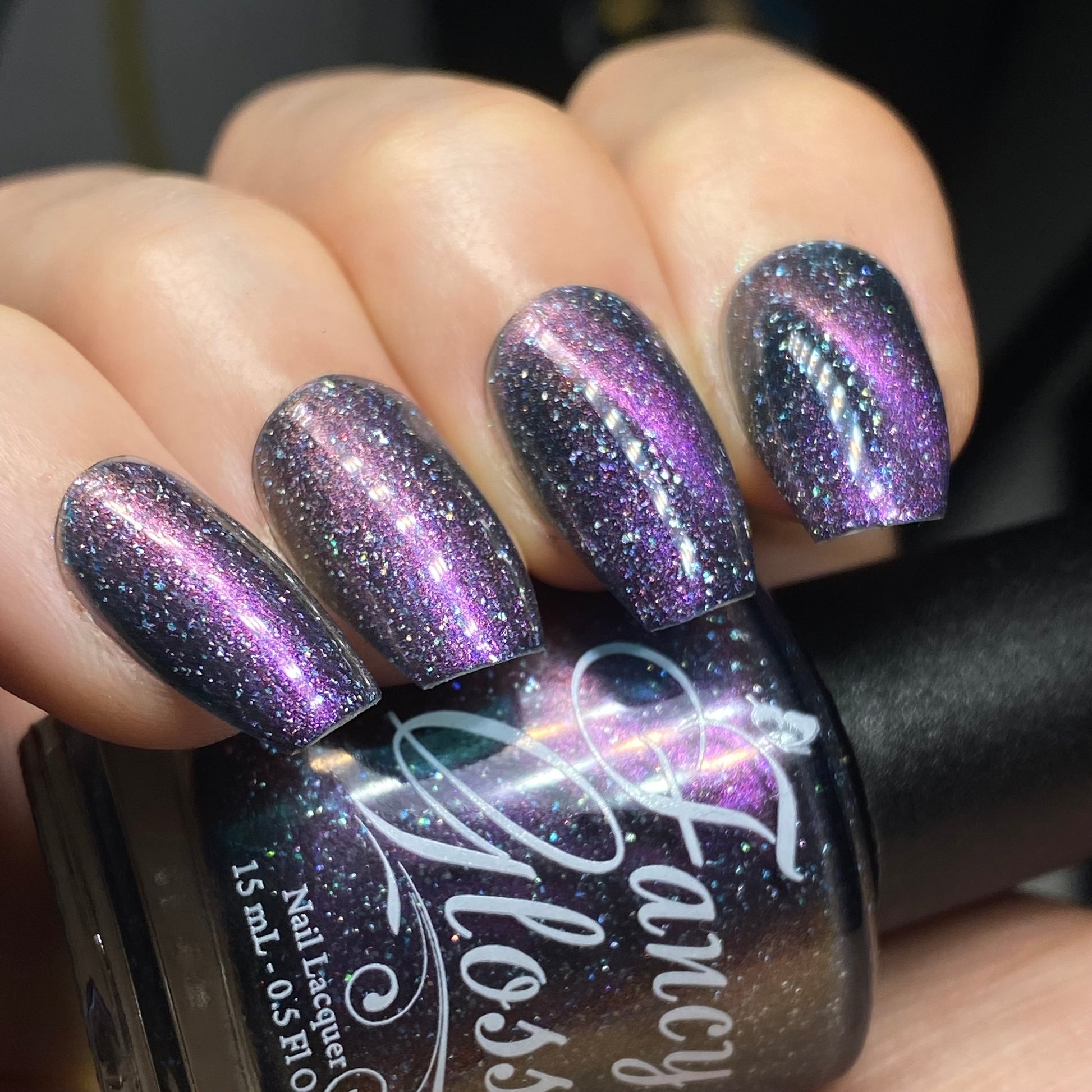 Dark teal base with purple/pink/copper magnetic pigment and micro holographic flakes.