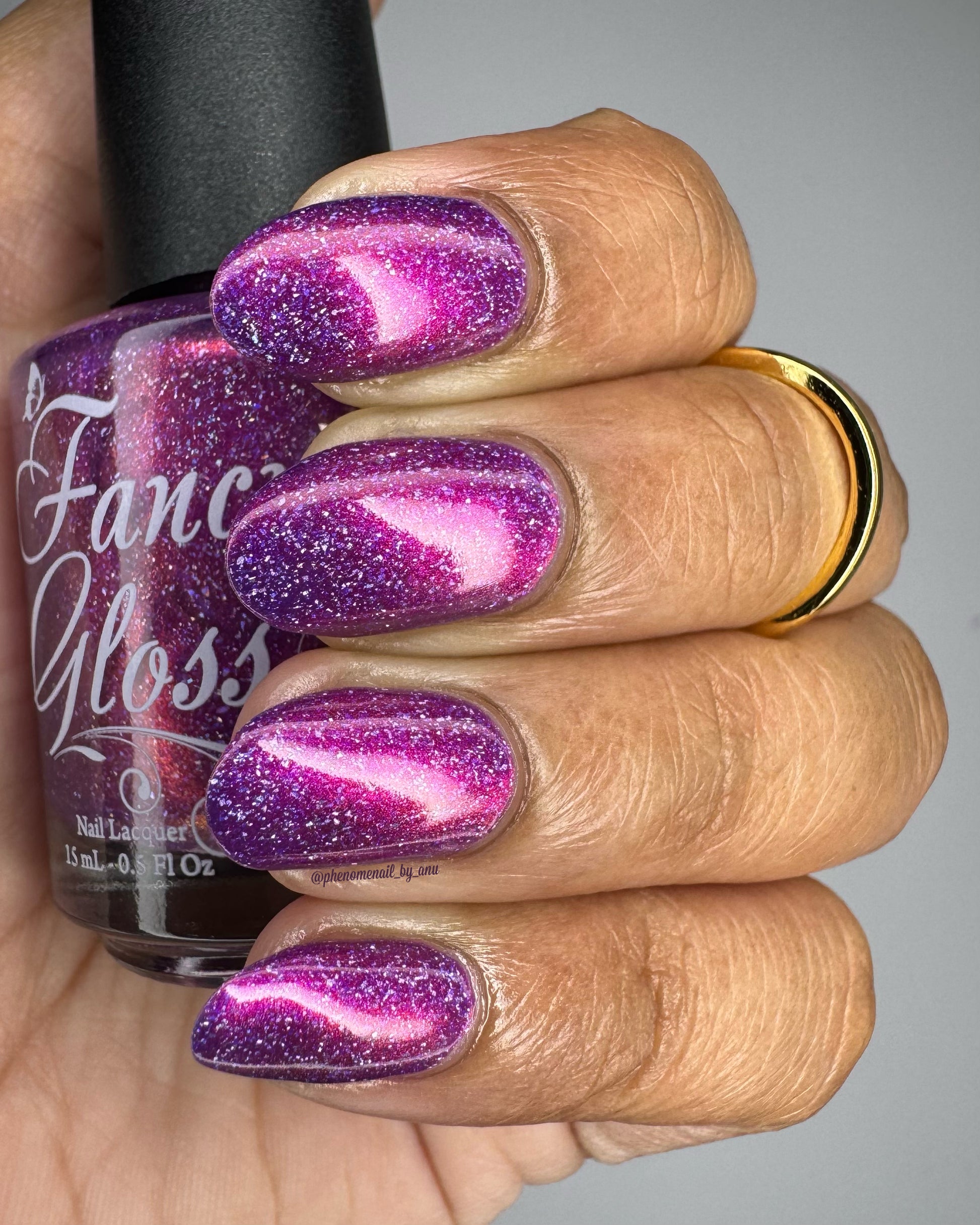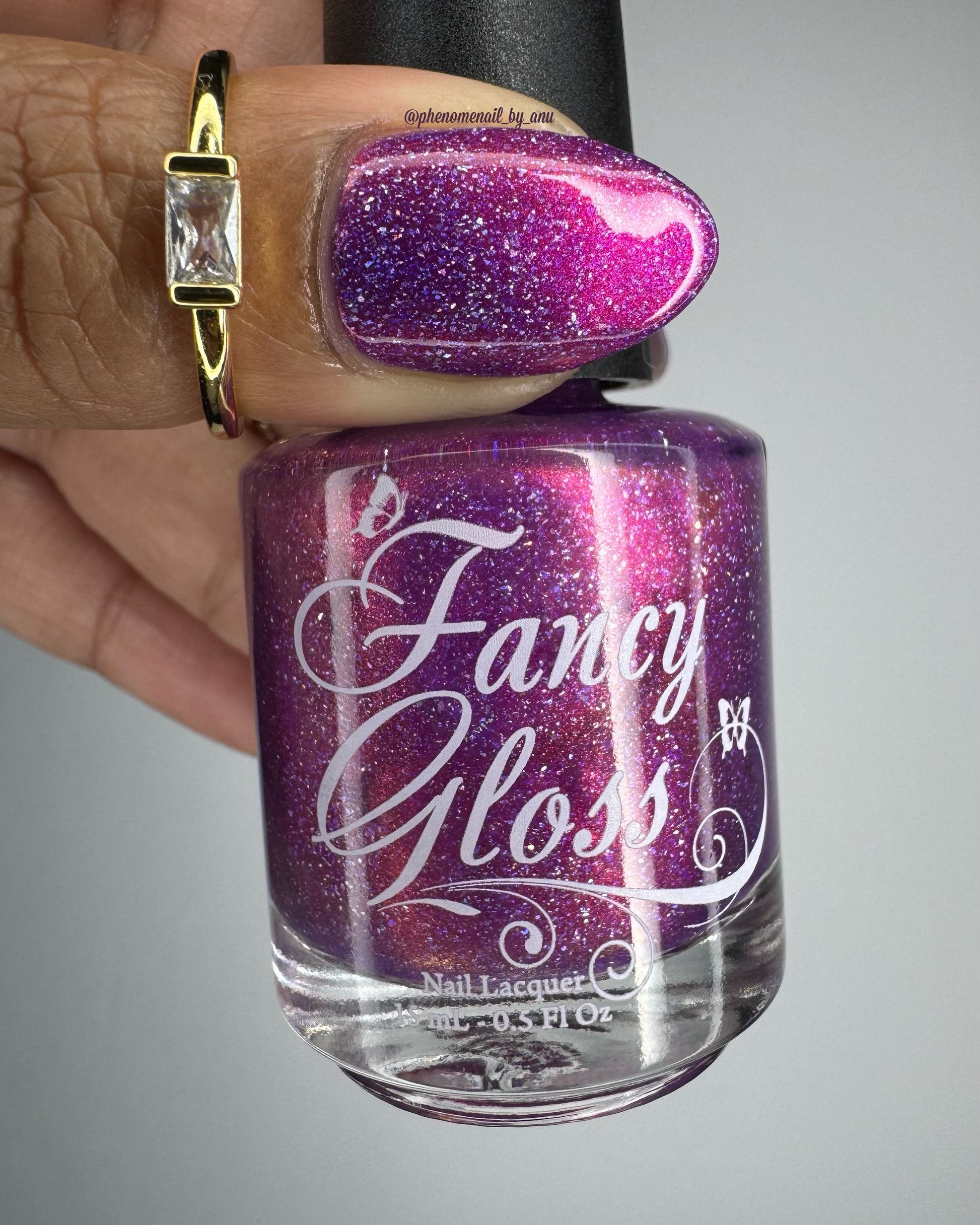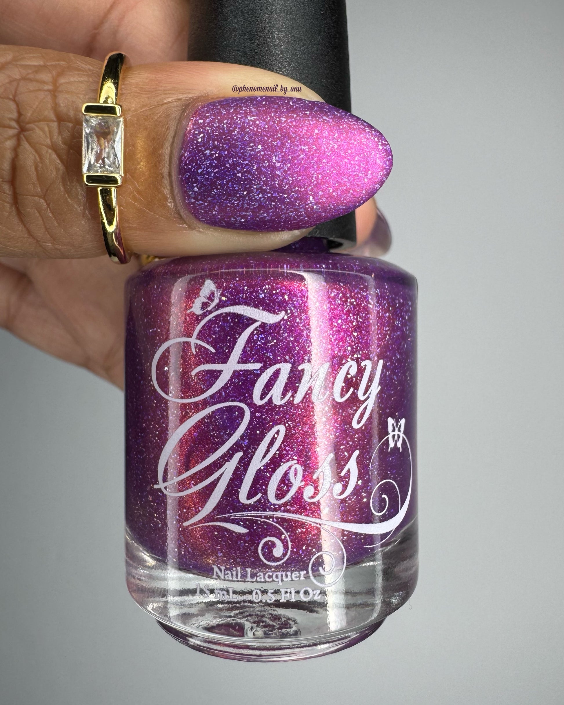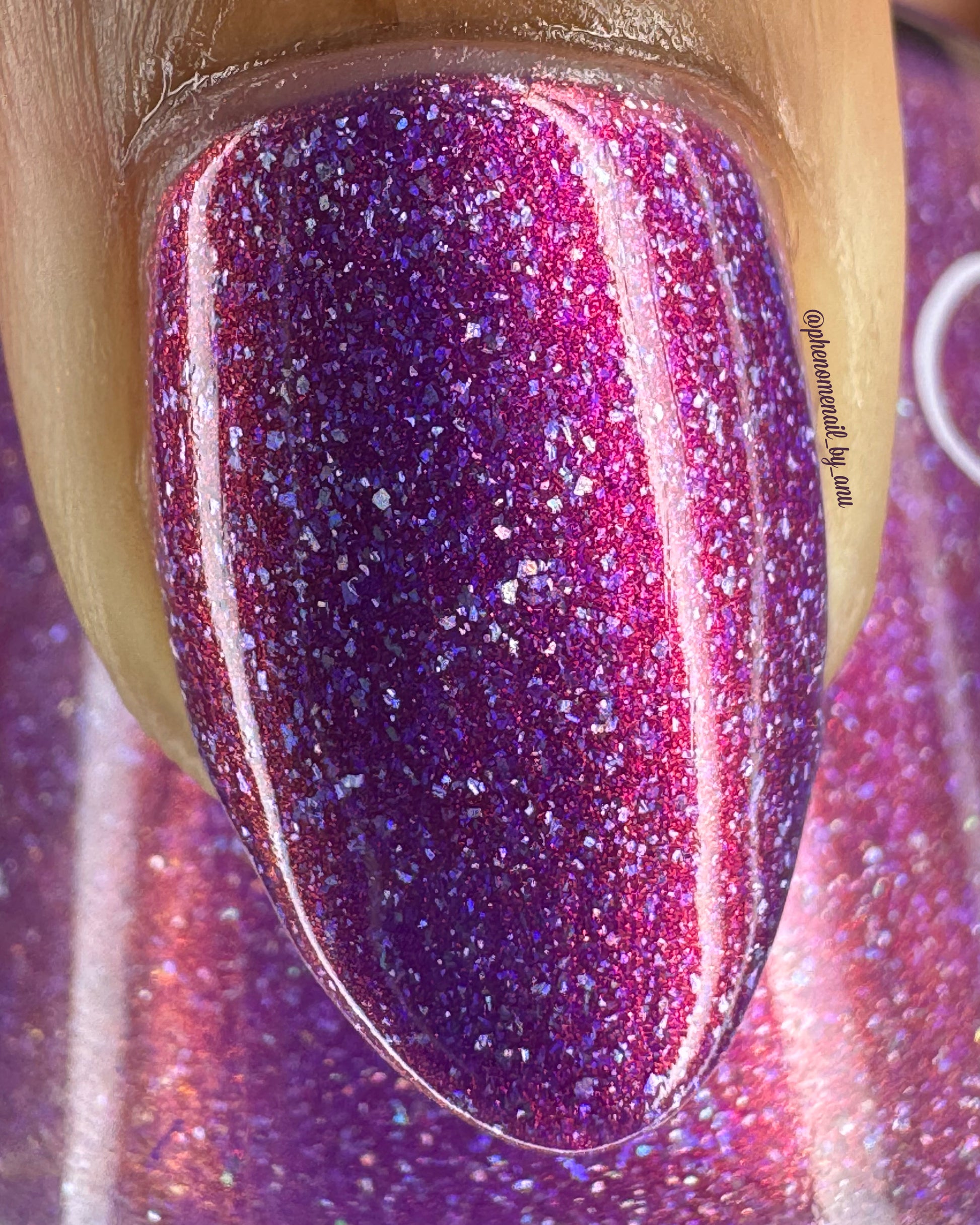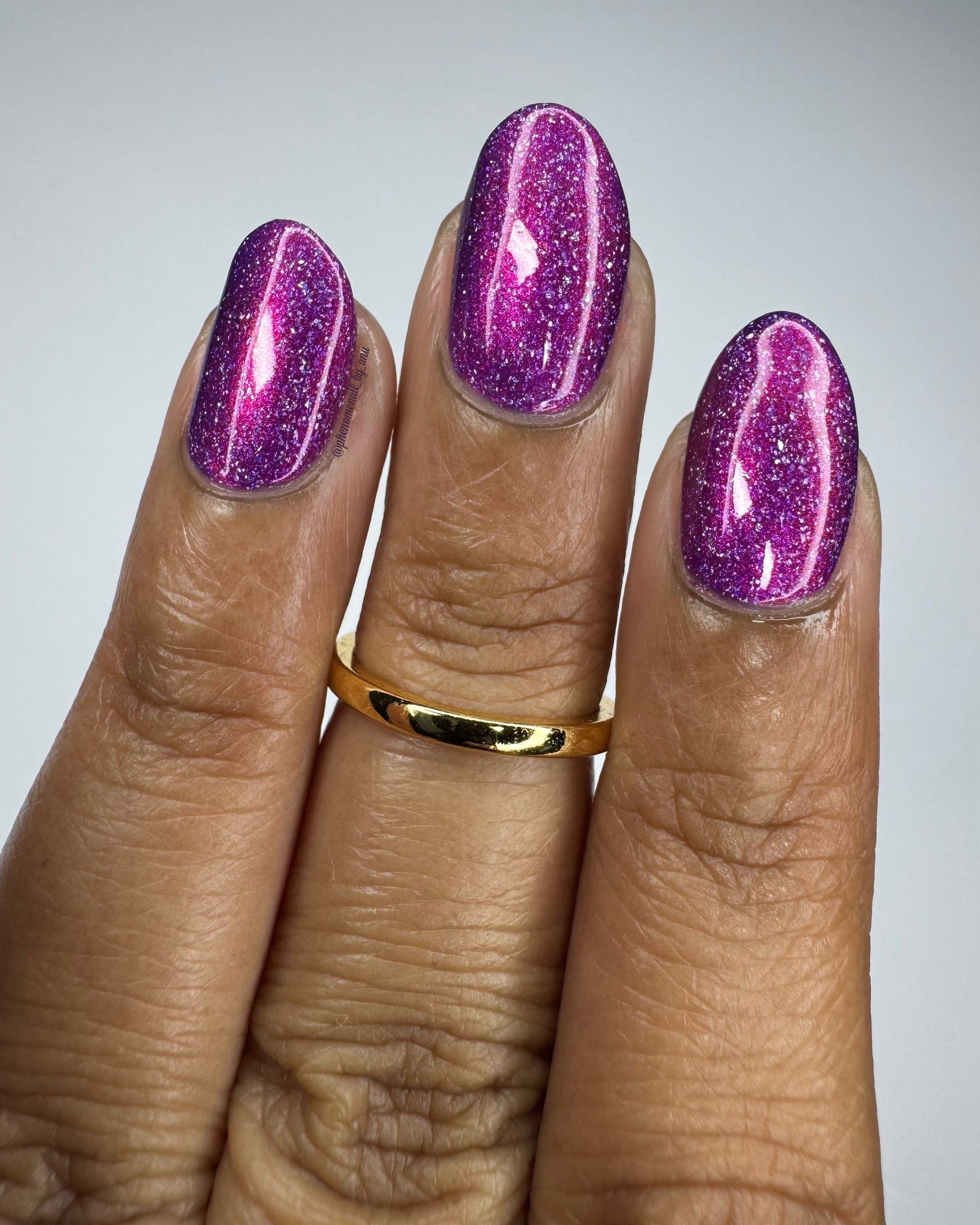 Violet base with pink/purple shimmer and holographic micro flakes.